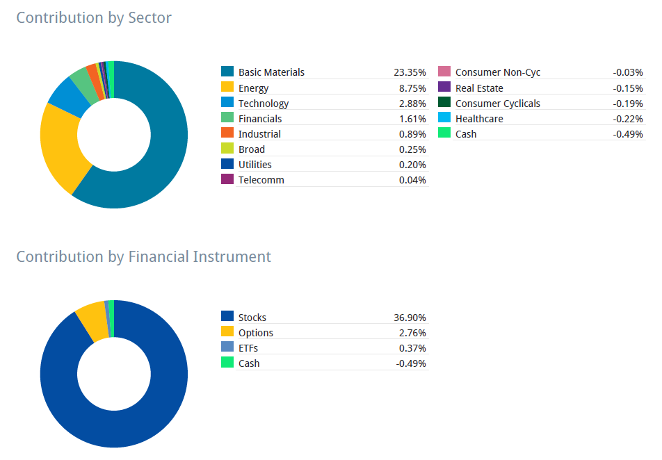 My best month as well as best start to a year. Returns were mostly from commodities. I traded around a bit, but anyone with a heavy portfolio weighting towards that or HBMs this month would have done really well by just buying and holding. While I feel good, I also feel like I was just at the right place at the right time.